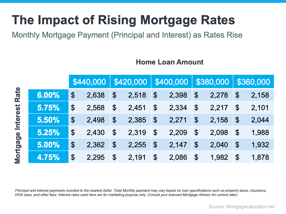 Mortgage rates play a significant role in your home search. As rates go up, they impact how much you’ll pay in your monthly mortgage payment, which directly affects how much you can comfortably afford. Here’s an example of how even a quarter-point increase can have a big impact on your monthly payment (see chart below):